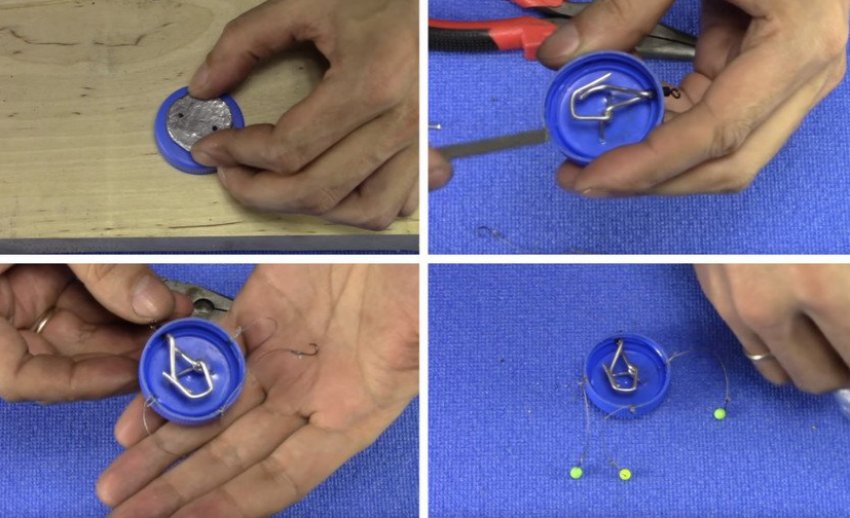 - Используя тонкую нить из капрона, смастерите 4 поводка длиной 150 мм. Привяжите крючки. На двух концах закрепите карабины.