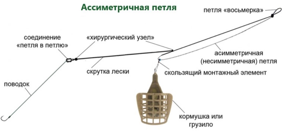 Ассиметричная петля. Полный аналог предыдущего оснащения, но одна из сторон имеет большие размеры. Это приспособление предназначается для рыбаков, имеющих значительный опыт в заходах на леща. Интерес речного обитателя к приманке будет виден заранее.