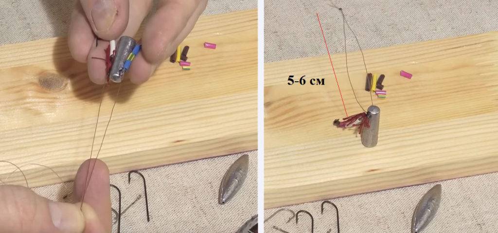 Берем основную леску, пропускаем через нее крючок, за ним грузило, затем снова крючок, складываем концы лески вдвое и на расстоянии 5-6 см, от края грузила делаем узел обычной или двойной восьмеркой, при затягивании узла не забываем его смачивать.