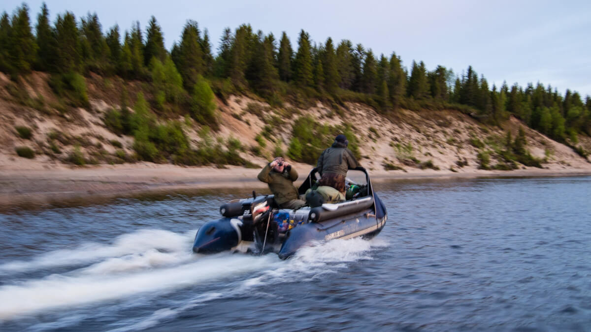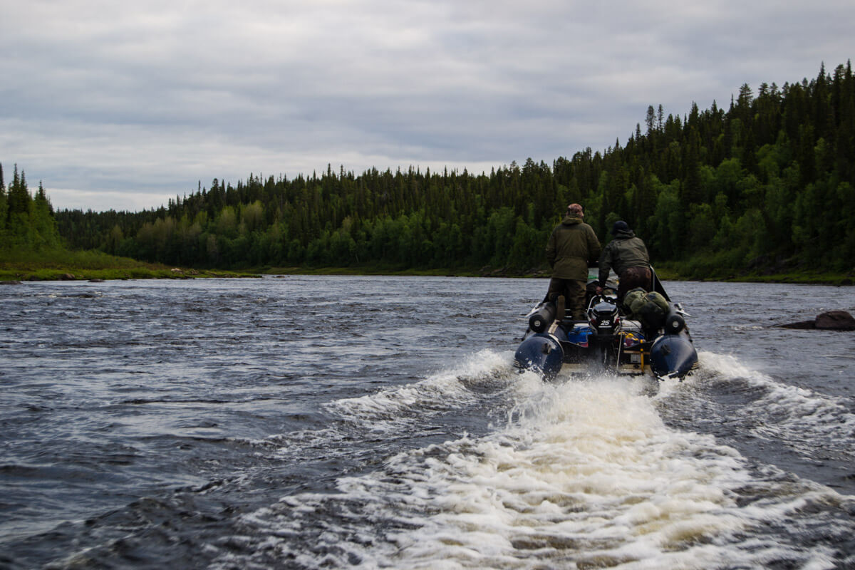 Разбор двух лодок Solar 420, установка на них двух водометов Mercury по 25 л.с., упаковка вещей в гермомешки и приобретение лицензий занимает около часа, после чего, символически приняв «на ход ноги» и «за рыбалку», мы выдвигаемся вверх по реке: