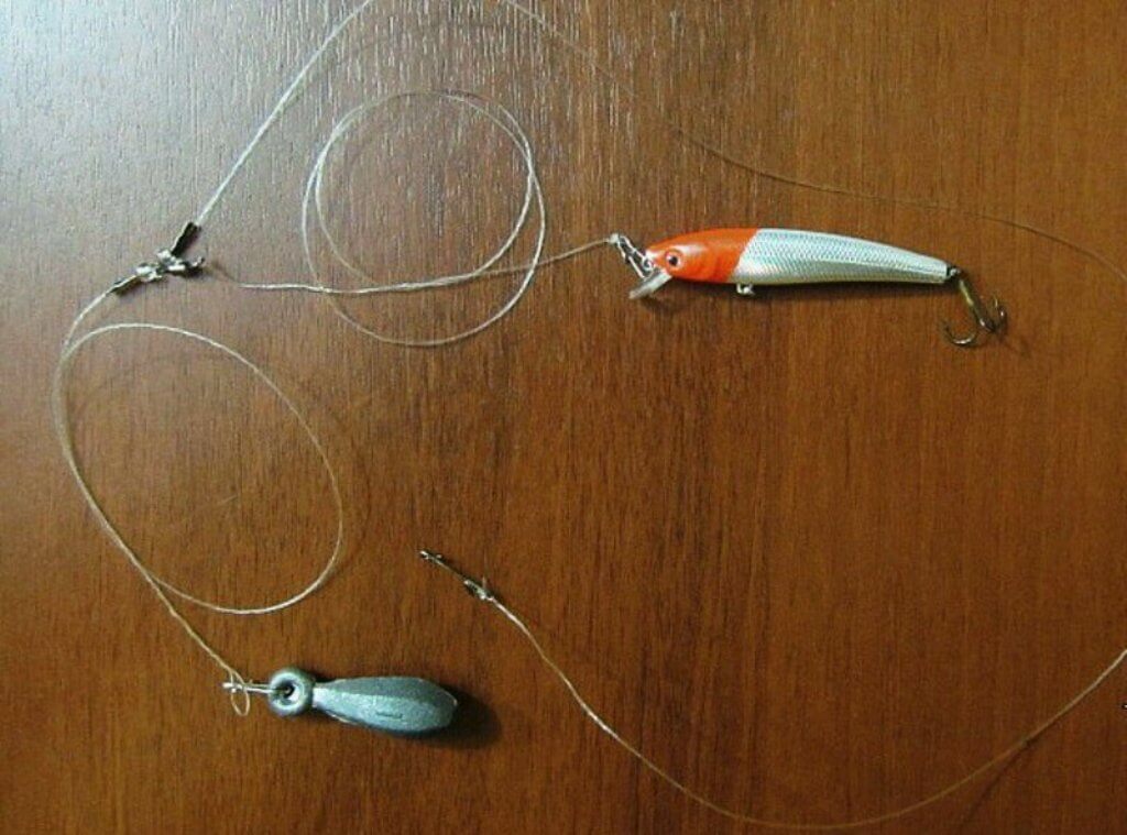 Чтобы поводок не скручивался во время проводки, рекомендуют устанавливать дроп-шот, представляющий собой леску с концевым грузом в форме шарика либо груши. Отводной поводок крепят к тройному вертлюжку, привязывают грузила.