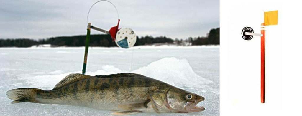 Ловля судака зимой на жерлицы, именно такого типа будет наиболее удобной и эффективной. Правда у них есть один недостаток, в большинстве случаев сигнальный флажок не имеет большой длины, из-за чего при ловле на сильно заснеженных участках их плохо видно на расстоянии.