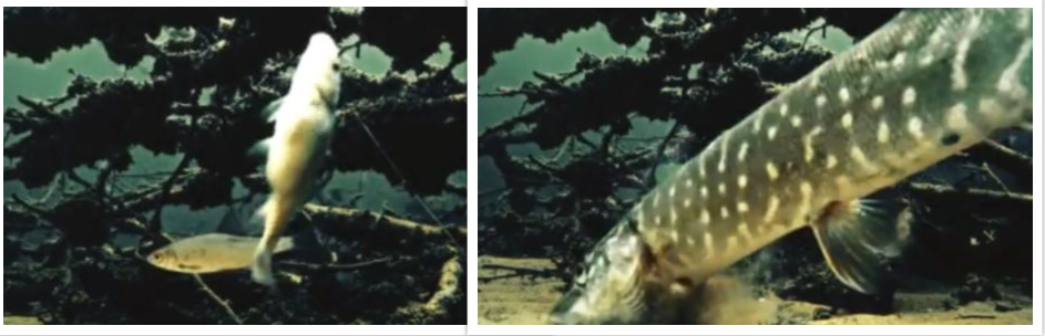 Во время жора щука раскрывает свое присутствие всплесками. Она гоняется за добычей, но по-прежнему осторожна. Проводка приманок в это время используется более энергичная.