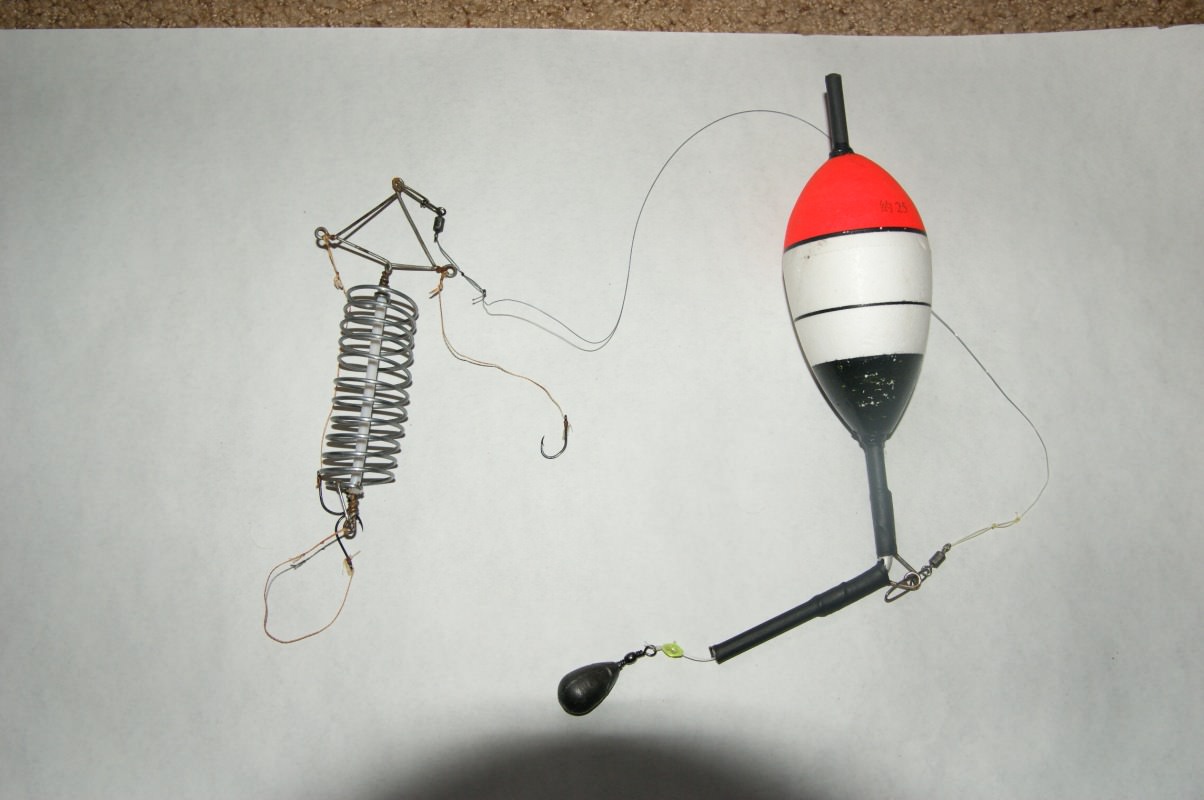 Если ловля планируется на поверхности, то лучше всего подойдет снасть с пружиной. Она обладает большой грузоподъемностью. Чуть пониже поплавка находится кормушка или пружина, над ней располагаются крючки.