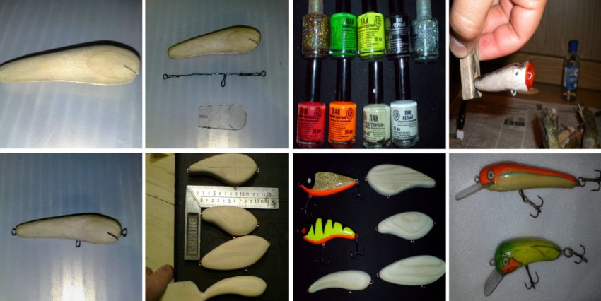 - Сначала необходимо определиться с формой приманки. Для первой попытки подойдут как можно более простые варианты известных производителей. В качестве материала изготовления лучше брать легкие сорта древесины, слишком тяжелые и прочные не только ухудшат игру готового изделия, но и сильно усложнят процесс изготовления.