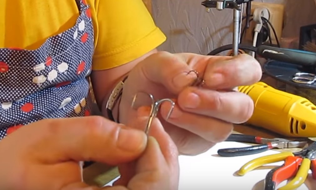 Чтобы мандула на судака своими руками приобрела законченный вид, делаем каркас для приманки. В классическом виде приманки на каркас крепится 2 крючка: в области головной и хвостовой частей. К одному из концов проволоки прикрепляем тройник, для чего потребуется предварительно сделать 2 кольца на проволоки: на одно монтируем крючки, а за второе – соединяем с основной леской. Проще крепить леску к кольцу, выходящему за пределы изгиба.