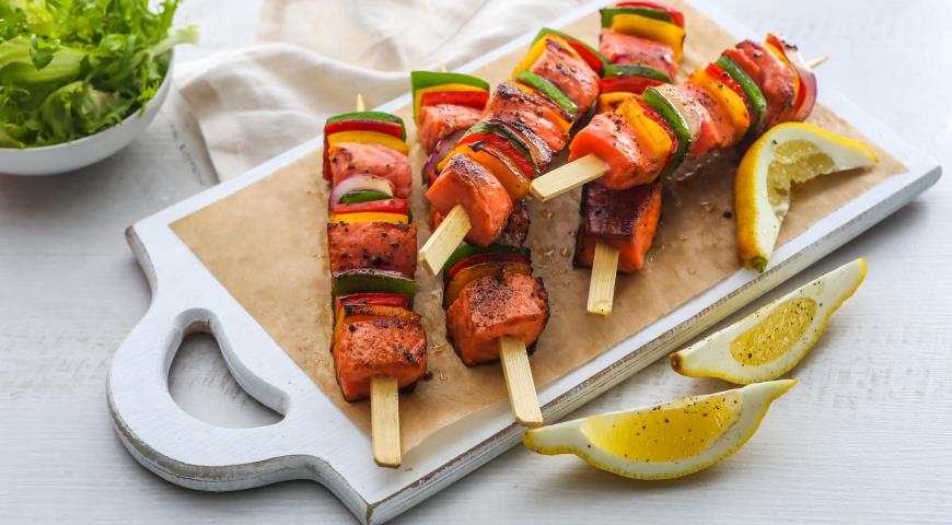 Наверное, вы видели какие нарядные в кафе или ресторанах подаются рыбные шашлычки. Обычно нежные кусочки филе чередуется с яркими овощами. Это сделано не только для красоты. Благодаря овощной нарезке увеличивается выходной вес готового блюда, а также мясо напитывается соками и будет не таким сухим, как в «гордом одиночестве».