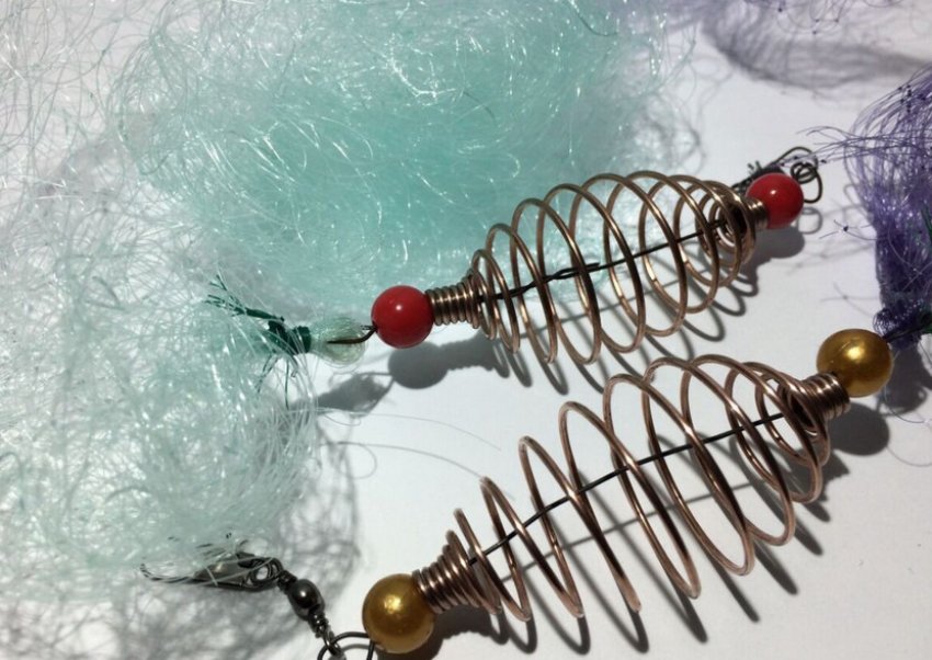 В качестве кормушек берут пружины диаметром 10–12 мм и длиной 3–4 см. Они должны быть сделаны из проволоки сечением 1–3 мм. Внутри их находится трубочка, через которую кормушка нанизывается на леску.