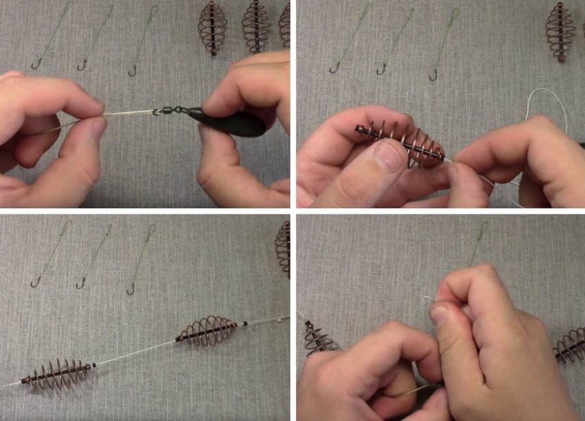 - Прикрепить к другой стороне вертлюжка леской 3 пружины-кормушки на расстоянии 8–15 см друг от друга и от грузика.