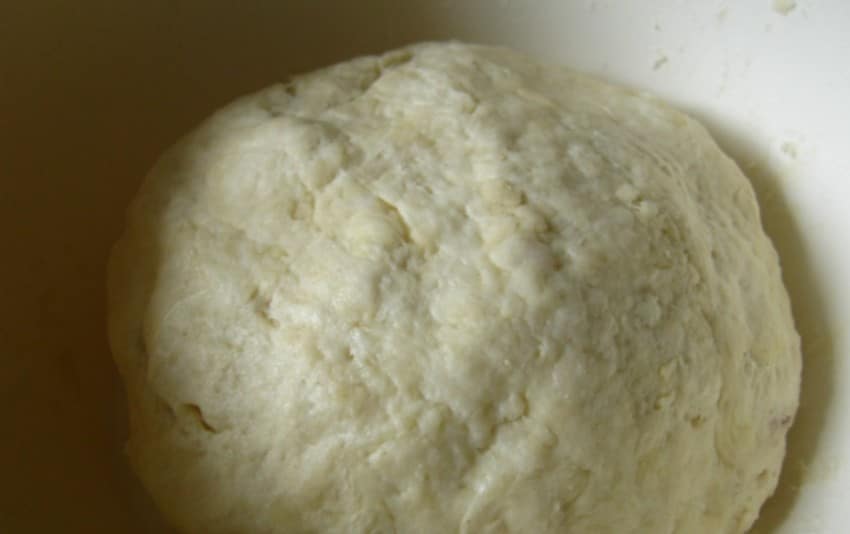 - Добавляйте постепенно муку. Когда масса загустеет, продолжайте вымешивать руками. Готовую основу оберните пленкой, уберите на час в холодильник.