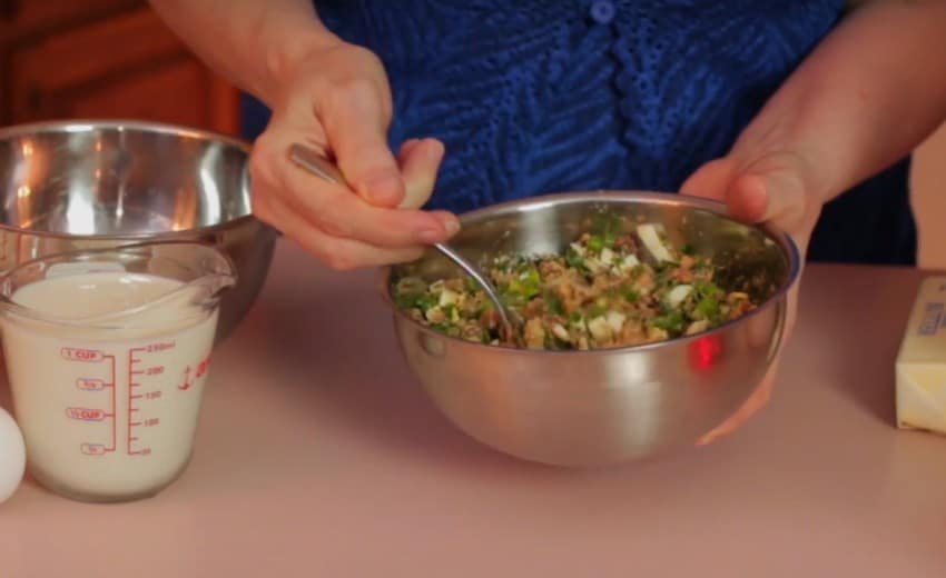 - Смешать все компоненты начинки в одной емкости.
