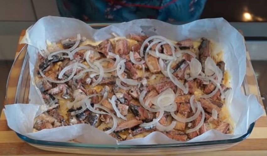 - Первая укладывается в промасленную форму. Сверху основа покрывается ломтиками картофеля и рыбой с луком. Картофельные дольки можно слегка подсолить.