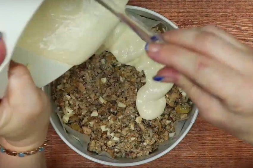 Налейте в смазанную маслом жаропрочную форму ½ часть теста.