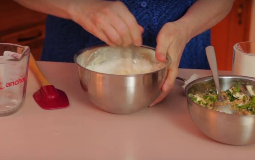 - Для приготовления теста смешать майонез, йогурт, соль, яйца до однородного состояния.
