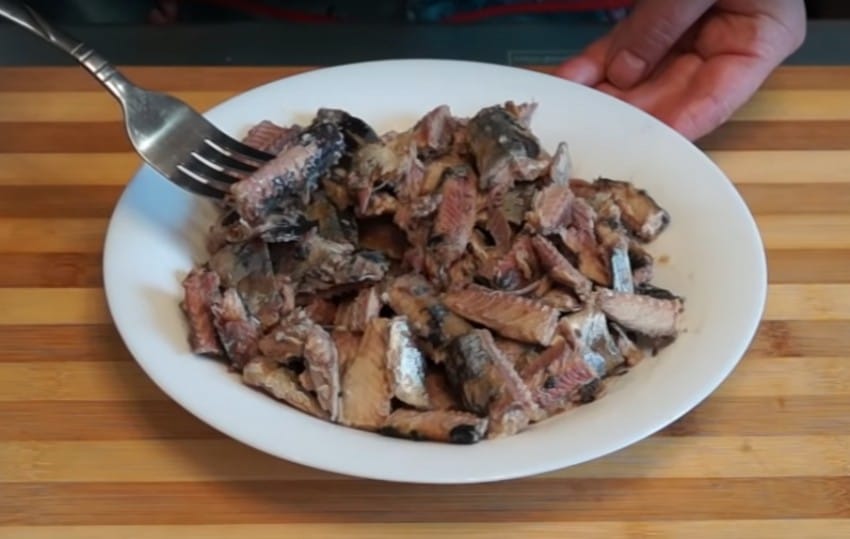 - Рыба избавляется от масла и косточек. Удобнее всего просто размять ее вилкой.
