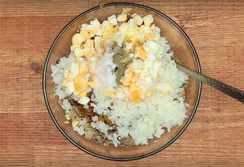 2. Луковицу порежьте полукольцами, обжарьте на масле до золотистого цвета. Слегка остудите, перемешайте с рисом, рыбой и измельченными яйцами. Посолите и поперчите при необходимости.