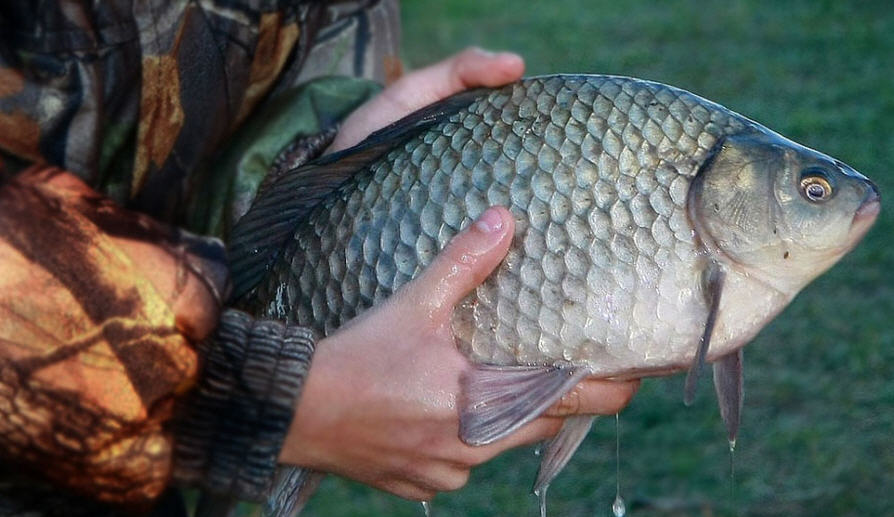 - Серебристый карась. Определить его можно по вытянутому телу, прозрачным плавникам и крупной чешуе серебристого оттенка. Карась серебряный имеет средние размеры: длина достигает 35-40 см, а максимальный вес — 2-2,5 кг.
