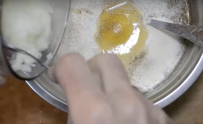 - Смешайте продукты с яйцами и мукой. Добавьте молоко, соль и специи.