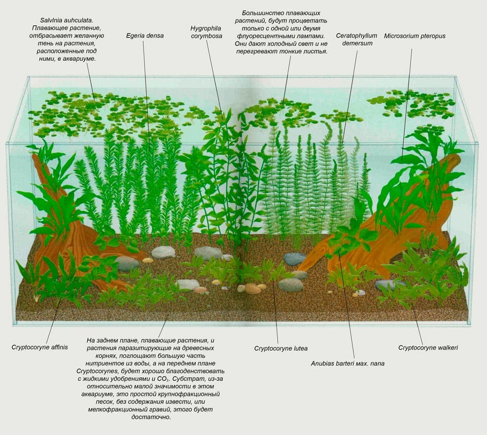 Главная роль в аквариуме отводится рыбкам с живыми растениями, но, чтобы им в воде было комфортно, необходимо подготовить для них среду обитания.