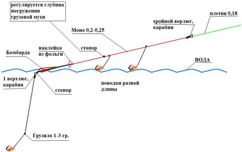 Стоит поставить вертлюжок большего размера. Маленький, конечно, менее заметен, но он может расколоть бусину своим миниатюрным колечком. Наличие бусинки в такой оснастке обязательно, иначе вертлюжок застрянет в антенне, после чего бомбарда не сможет съехать по шнуру.