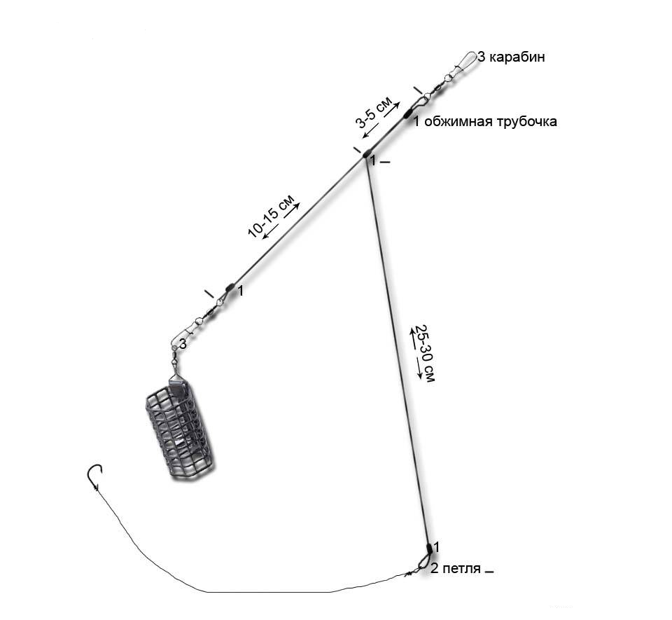 Петля Гарднера представляет из себя основную леску с приманкой, от которой отходит поводок с грузкормушкой. Как правило, основная леска должна быть большего диаметра (0,2 – 0,3 мм), а второстепенная не более 0,2 мм.