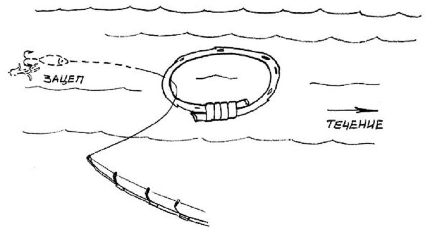 - Еще одним простым отцепом служит конструкция «плывущее кольцо». Изготовить его можно из подручных средств, например, из ветки ивы или другого гнущегося дерева. Ветка длиной 50-70 см и очищенная от коры сворачивается в кольцо, стык соединяется леской или веревкой. Внутрь получившегося отцепа продевается леска от зацепившейся снасти и «плывущее кольцо» забрасывается дальше по течению от приманки. Когда кольцо начинает плыть рядом с местом зацепа следует сделать несколько резких порывов удилищем, что приведет к освобождению приманки.