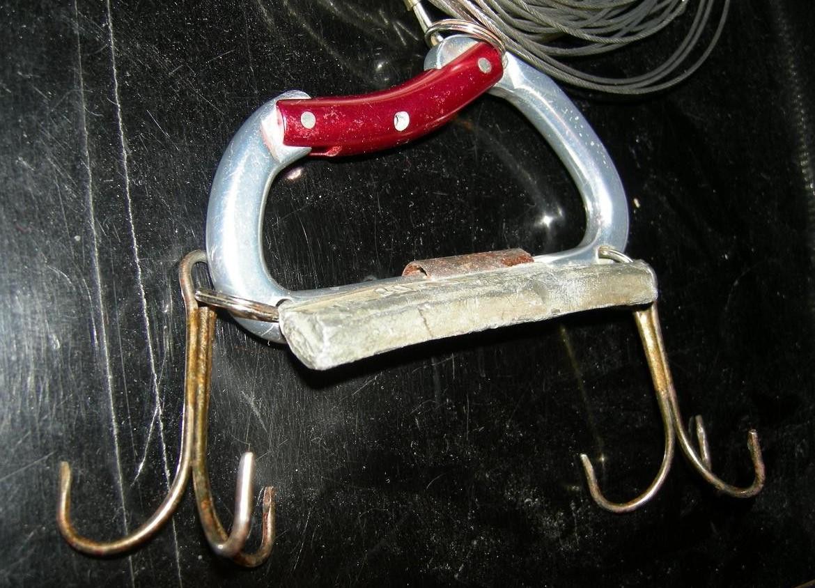 - «Кошка». Эта конструкция представляет собой кольцо из свинца, вес которого достигает 200 г. Петлями из проволоки к кольцу соединяются тройники крупного размера. Во время опускания «кошки» по леске к зацепившемуся воблеру, его цепляют тройники и силой рывка освобождают искусственную наживку.