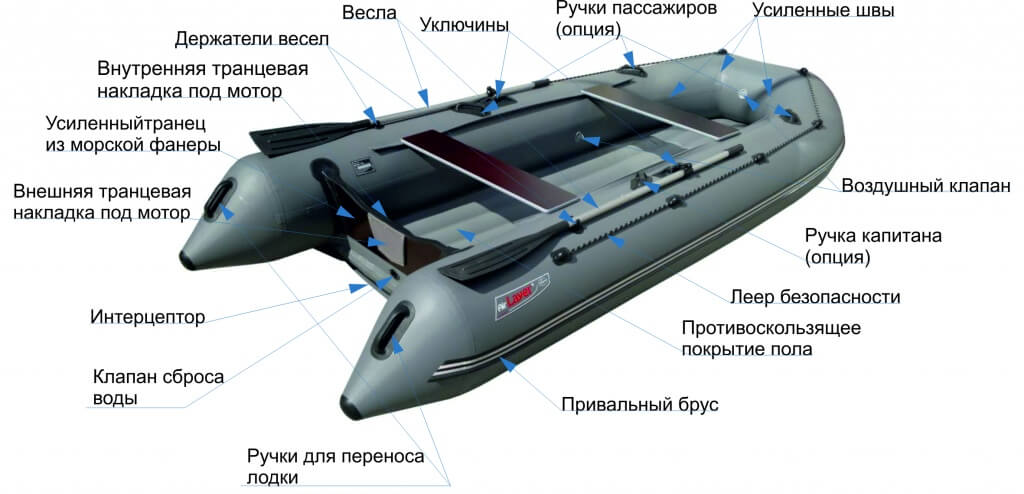 - Транец. Он нужен для крепления мотора. Есть лодки с транцем и без, с навесным и стационарным. Если остановили выбор на модели с транцем, то берите со стационарным – лучший вариант по ходовым характеристикам.