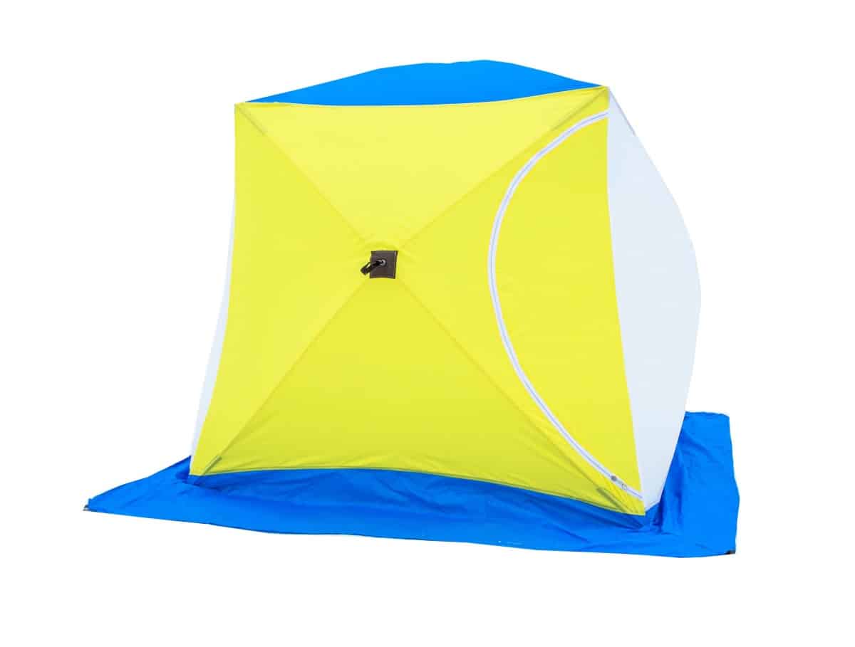 Модель в форме куба создана для зимней рыбалки, защищает от непогоды. Многие считают ее лучшей недорогой зимней палаткой. Стоит она 6200 рублей. Стены и крыша собираются отдельно, поэтому можно использовать для установки над лункой.
