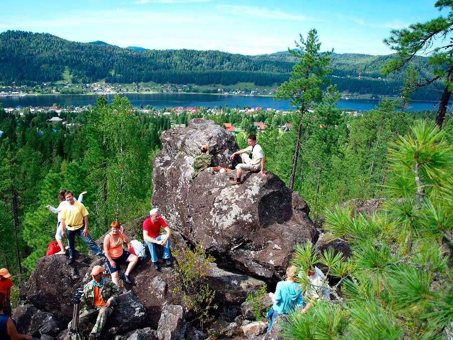 С обзорной площадки, находящейся чуть ниже вершины горы, высота которой, кстати, составляет 1156 метров над уровнем моря, открываются красивые виды на северную оконечность Телецкого озера, на исток Бии, на поросшие кедрачом горы и на расположенное на противоположном берегу село Артыбаш.