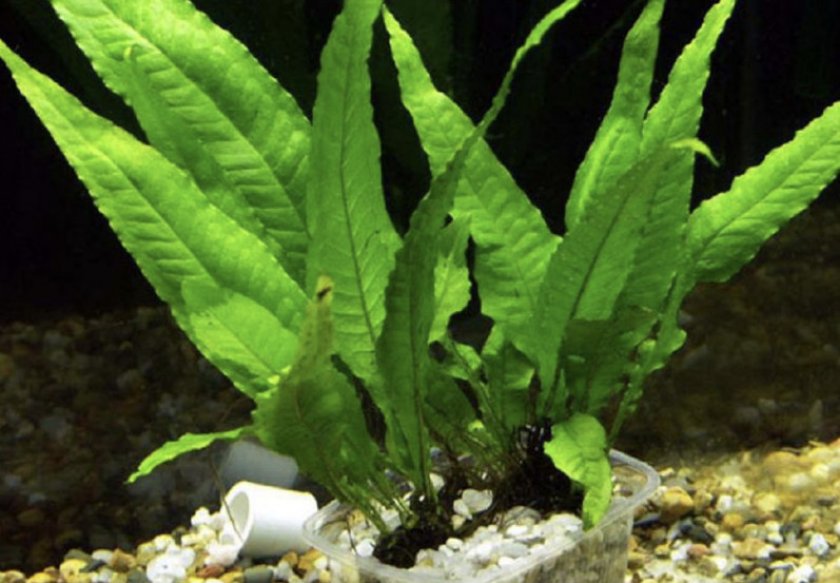 Располагать его следует на заднем плане и в центре аквариума. Темная зелень длинных листьев микросорума будет великолепно сочетаться со светлыми листочками других водных растений.