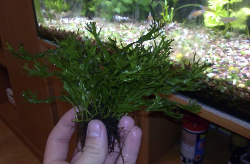 - Папоротник винделов. Довольно привлекательная и интересная разновидность, которую полюбили многие аквариумисты за ее необычные листья, имеющие разветвленные кончики. Максимальная длина одной пластины составляет 20 см. Растение считается весьма нетребовательным в содержании, поэтому идеально подойдет для новичков. Травоядные аквариумные рыбки не употребляют в пищу эту культуру.