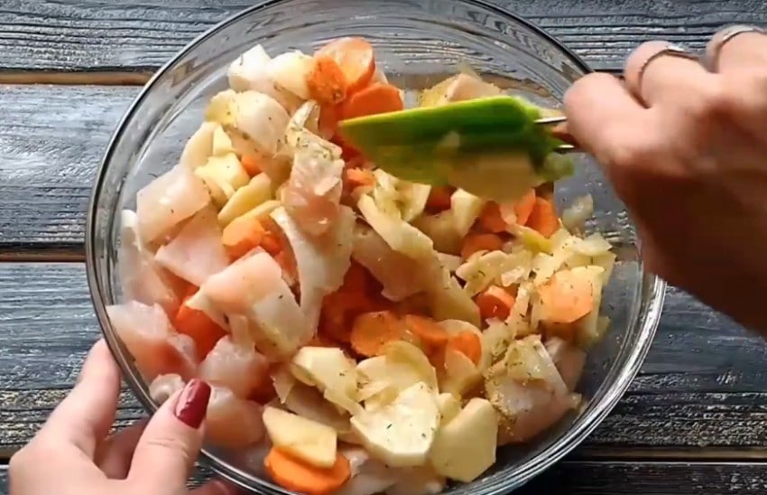 3. Разложите рыбу с овощами по горшочкам. В каждый залейте по 200 мл холодной воды. И отправьте в разогретую до 200ºС духовку на 45 минут.