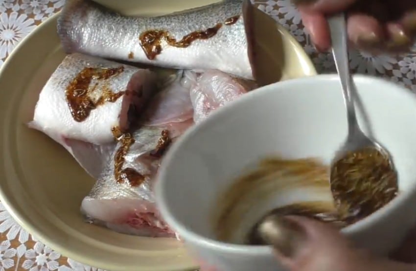 В тарелке смешиваем 2 ст. ложки горчицы с фрешем, выдавленным из второй половины лимона. Щедро поливаем судака соусом, а затем выкладываем его на противень (застеленный фольгой и смазанный маслом).