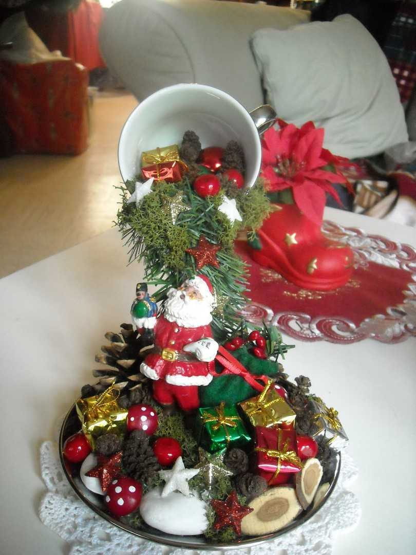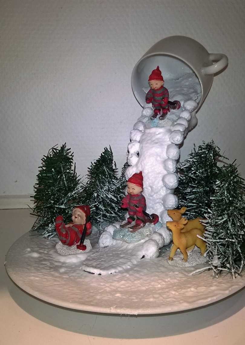 Тематика Нового Года предоставляет огромные возможности для вашей фантазии. Новогодняя парящая чашка своими руками будет отличным подарком родным и близким. Можно собрать компиляцию из хвои и елочных игрушек, из фигурки Санта-Клауса и оленей, из катающихся на санках детей. Вата послужит в качестве имитации снега, а веточки туи и кипариса для деревьев. Можно добавить мишуру и гирлянду.