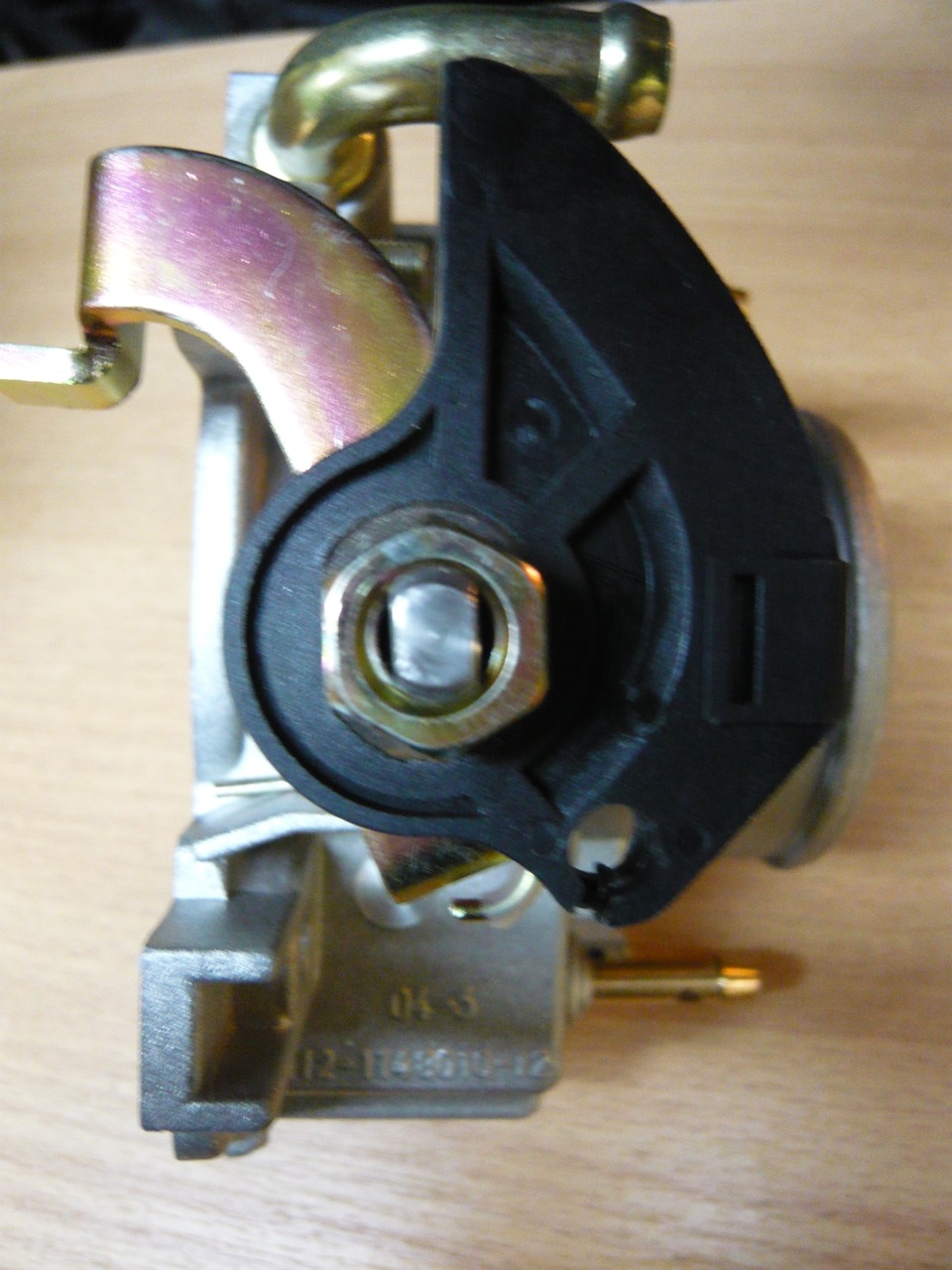 Способ изготовления — фабричный, маркировка лазером.Уровень качества соответсвует группе «А» (50 ppm).Подшипники — роликовые AUZONE, корпус подшипника виден со стороны шайбы-замка.Материал штуцеров — нержавеющая сталь.Герметизация — по две манжеты с каждой стороны (встроены в подшипник).Сектор привода заслонки упрочнен металлическими пластинами.Седло клапана приподнято на 2 мм по сравнению со стандартным для более надежной работы РХХ.По посадочным размерам (в том числе и диаметр патрубка гофра) корпус соотвествует стандартному.
