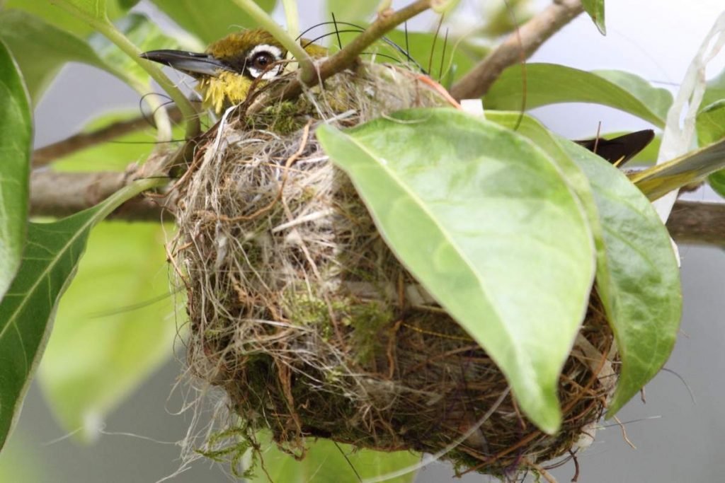 Самец оповещает о занятой территории своим пением. Обе птицы вьют гнездо в виде компактной глубокой чаши, подвешенной как в гамаке на развилке дерева, в кустах или на стеблях бамбука. На его обустройство уходит 4 дня. В качестве строительного материала используются мох, паутина, лишайники и растительные волокна.