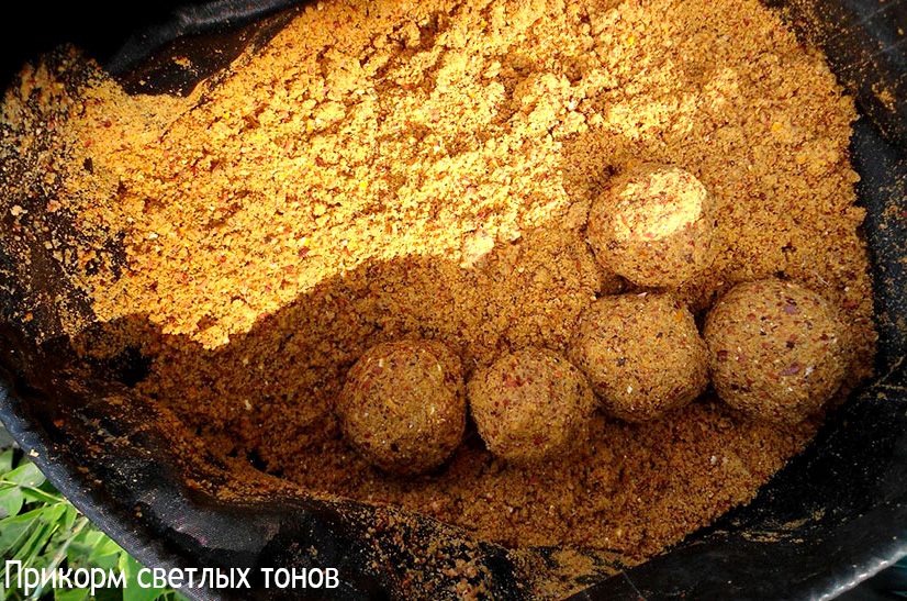 Считается, что рыбы цветов не различают или различают слабо. Особенно на глубине более 2 метров, куда слабо проникает солнечный свет. Так что особого значения цвету прикорма придавать не следует. Но вот в том, что лучше применять прикорм светлых тонов — желтого или грязно-белого — сходятся многие любители карповой ловли.