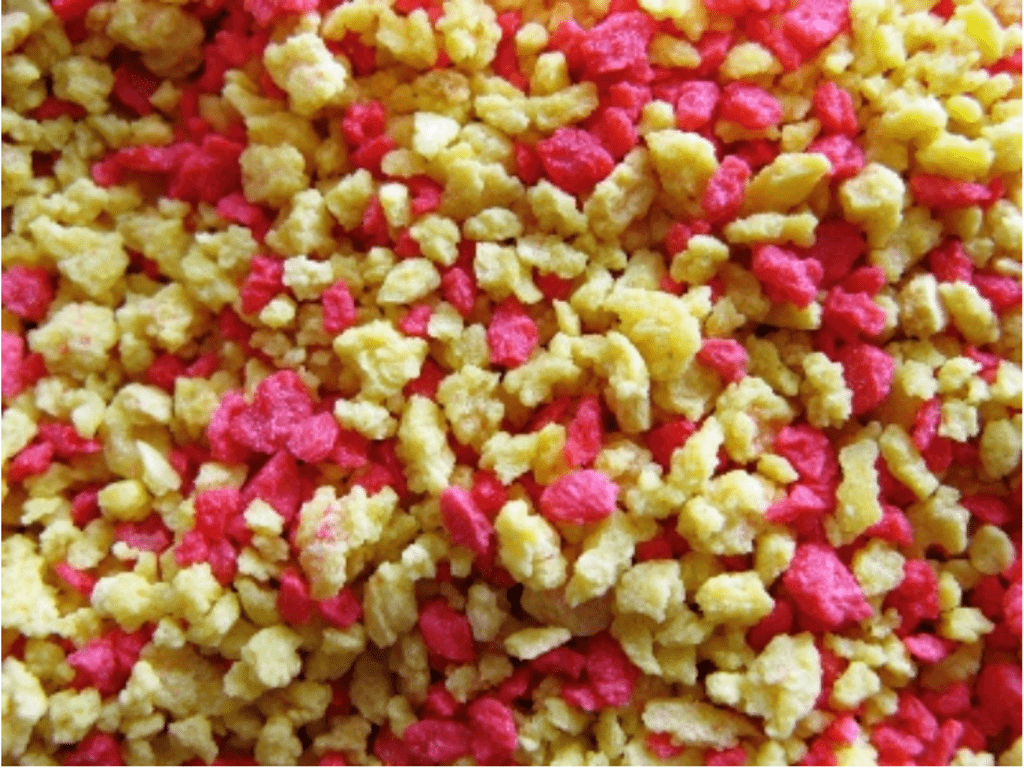 - манную крупу, муку, краситель высыпать в одну емкость, тщательно смешать;
