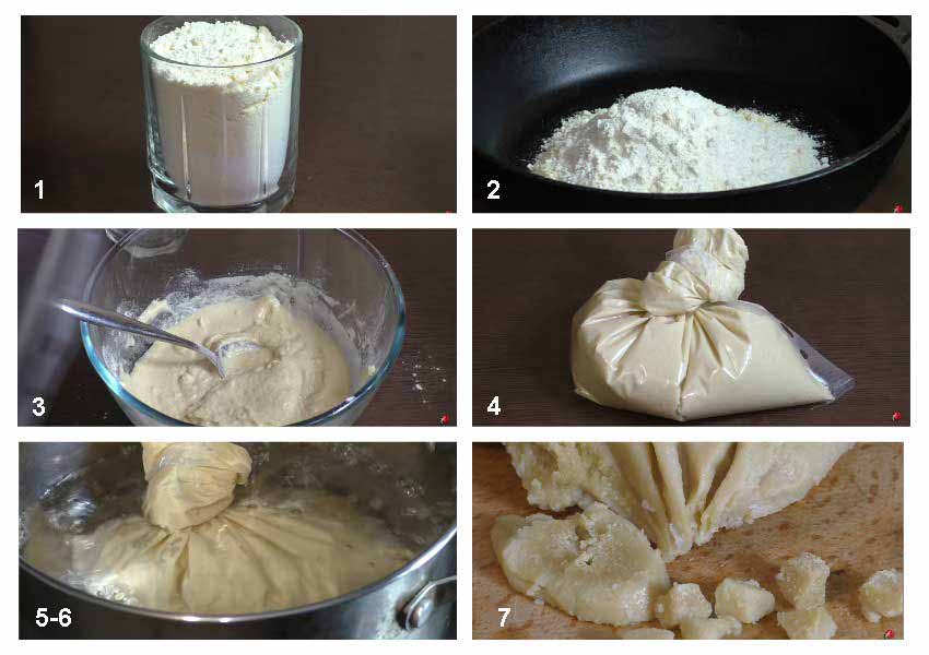 А после этого на нём обжаривается в течение пары минут кукурузная крупа. На протяжении всего этого времени её следует помешивать, чтобы она не пригорела. Сюда же на сковородку добавляется пшеничная мука в небольшом количестве и ещё немного обжаривается.