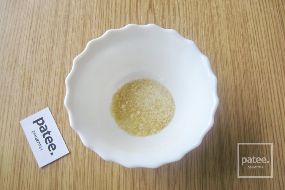 В процессе приготовления основы будущей заливки можно подготовить желатин. Две столовые ложки порошка помещаются в небольшую миску и заливаются тремя столовыми ложками воды, чтобы она полностью его покрыла.