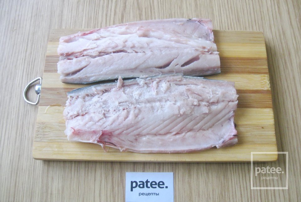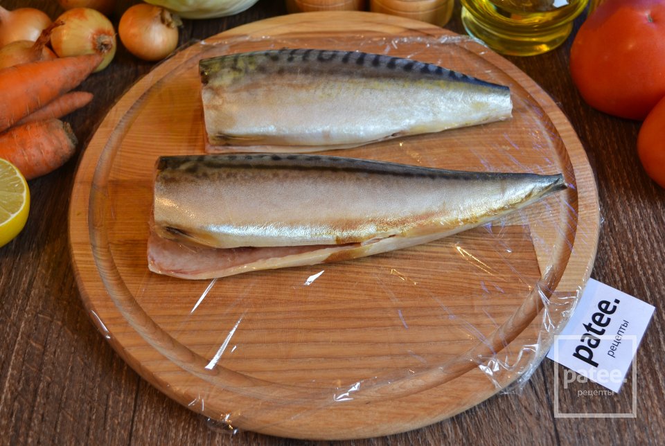 Разделать скумбрию: удалить голову, хвост, выпотрошить. Хорошо помыть снаружи и внутри, убрать черную пленку внутри на брюшке.