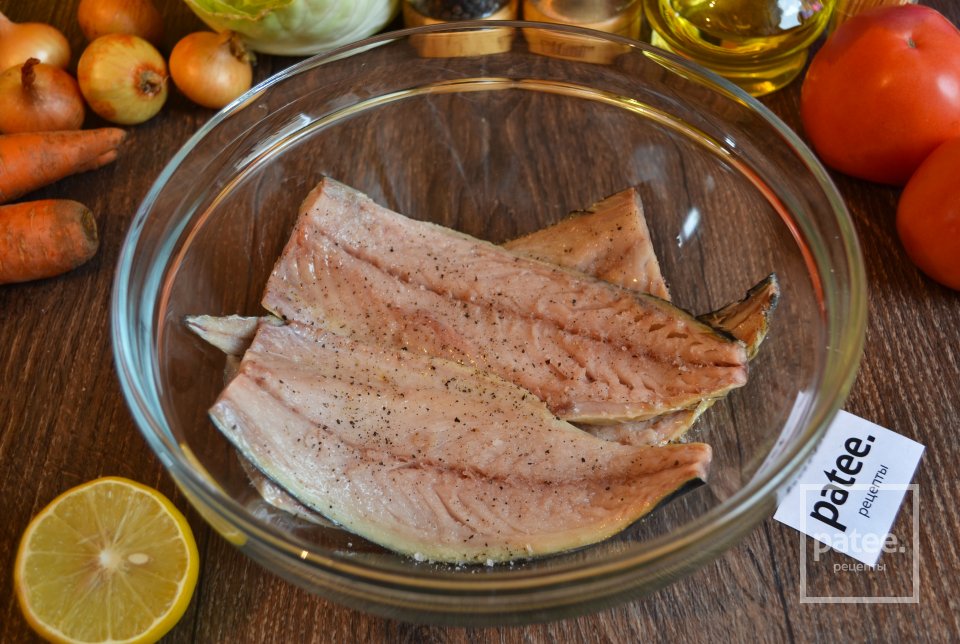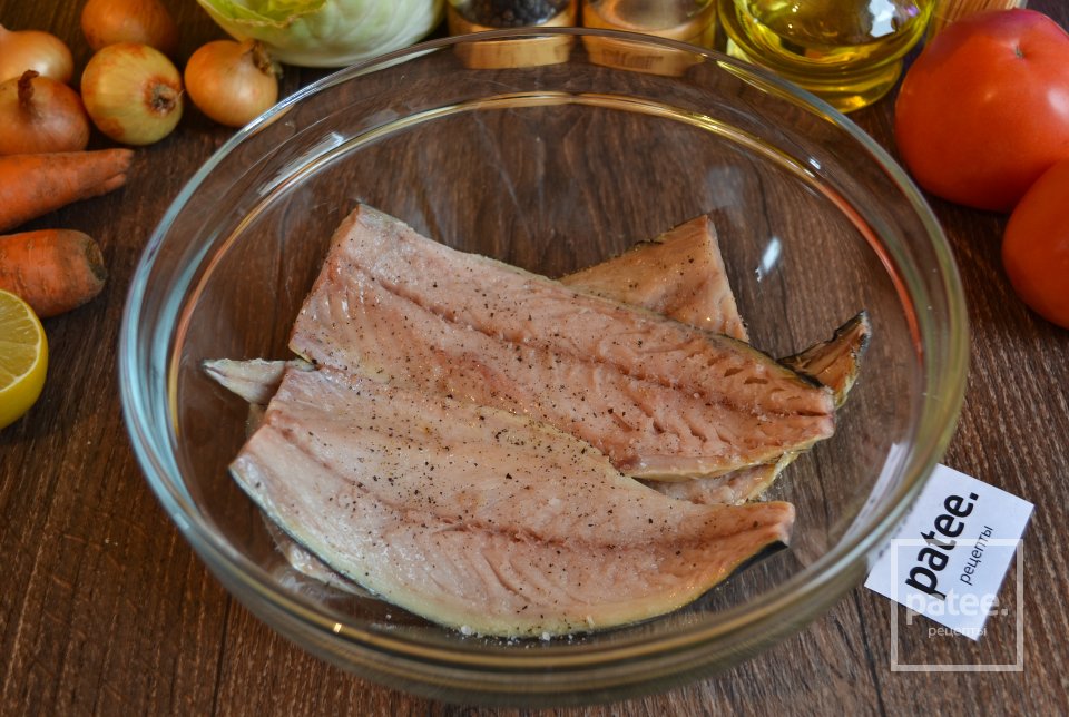 Выложить филе скумбрии в кастрюлю. Посолить по вкусу. Мне чайной ложки хватило.