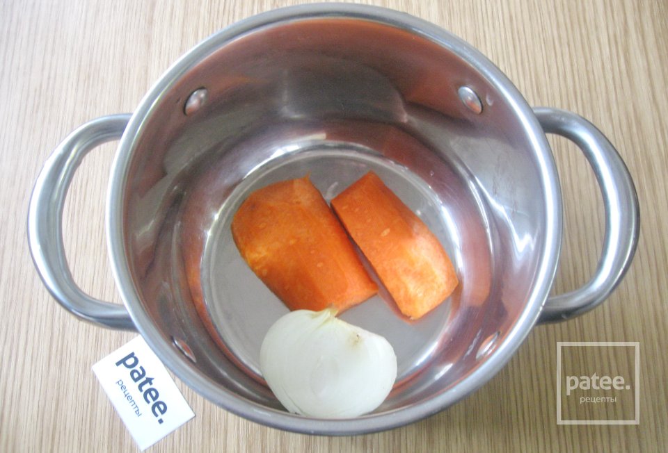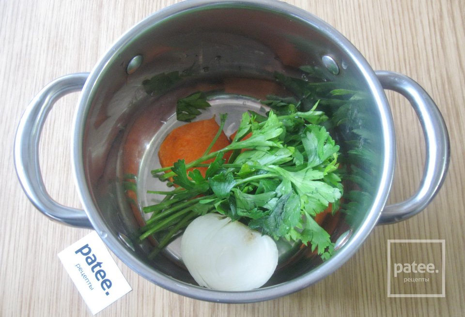 Залить морковь, лук и петрушку водой и поставить кастрюлю на плиту. Довести до кипения. Проварить 20 минут на среднем огне.