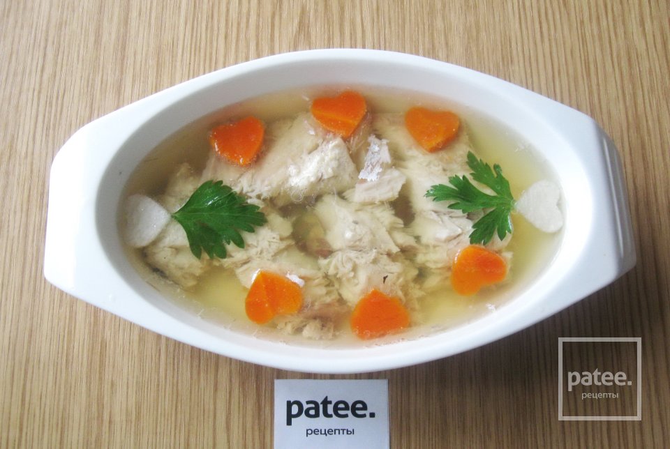 Бульону дают остыть, после чего заливают им аккуратно разложенные на блюде компоненты. Далее остужают в холодильнике в течение 3-4 часов.