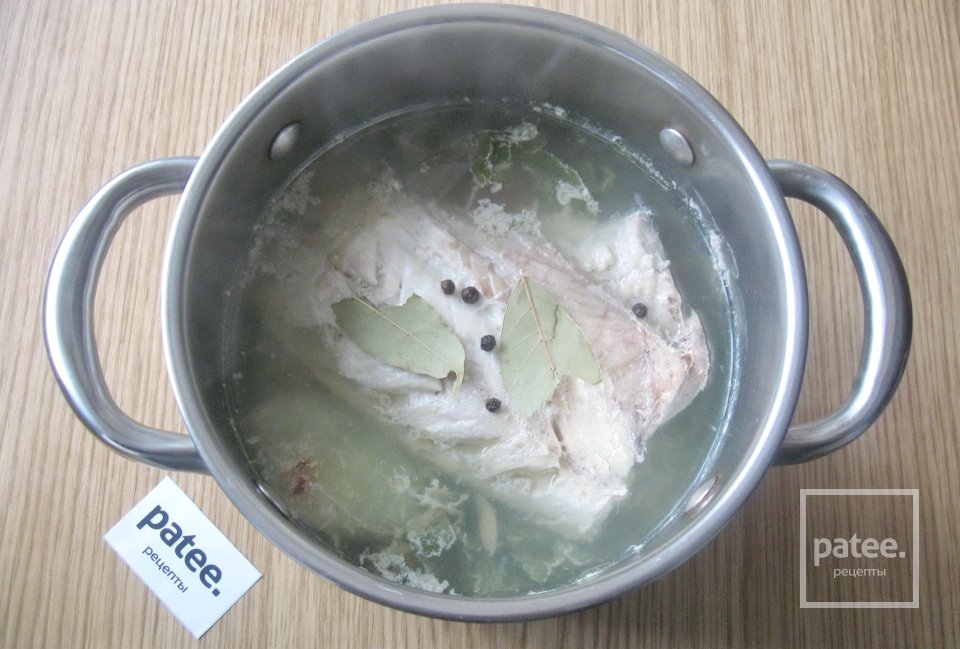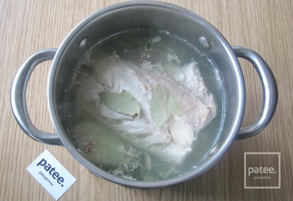 Чтобы приготовить вкусный бульон, к кусочкам рыбы, размещенным в кастрюле, важно добавить лук вместе с шелухой, лавровый лист, перец горошинами и кориандр. Специи придадут особенный аромат и вкус блюду