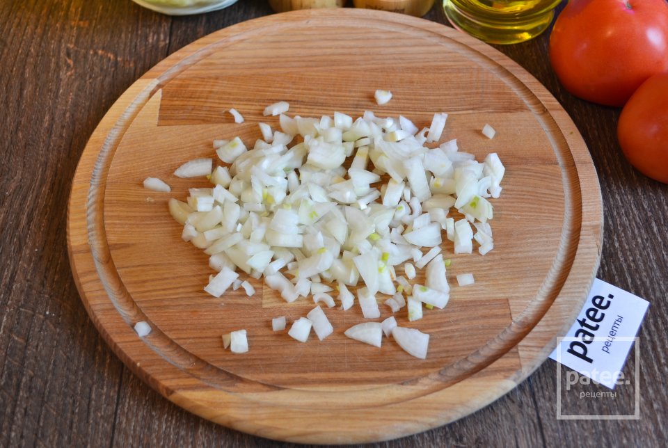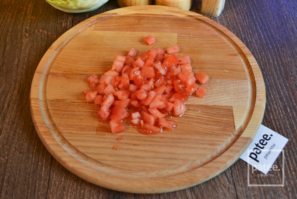Помидоры бланшируйте кипятком, очистите от кожицы и нарежьте кубиком.