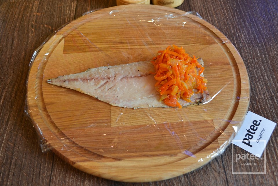На филе, с более широкой части, выложите 1-1,5 ст. л. начинки.