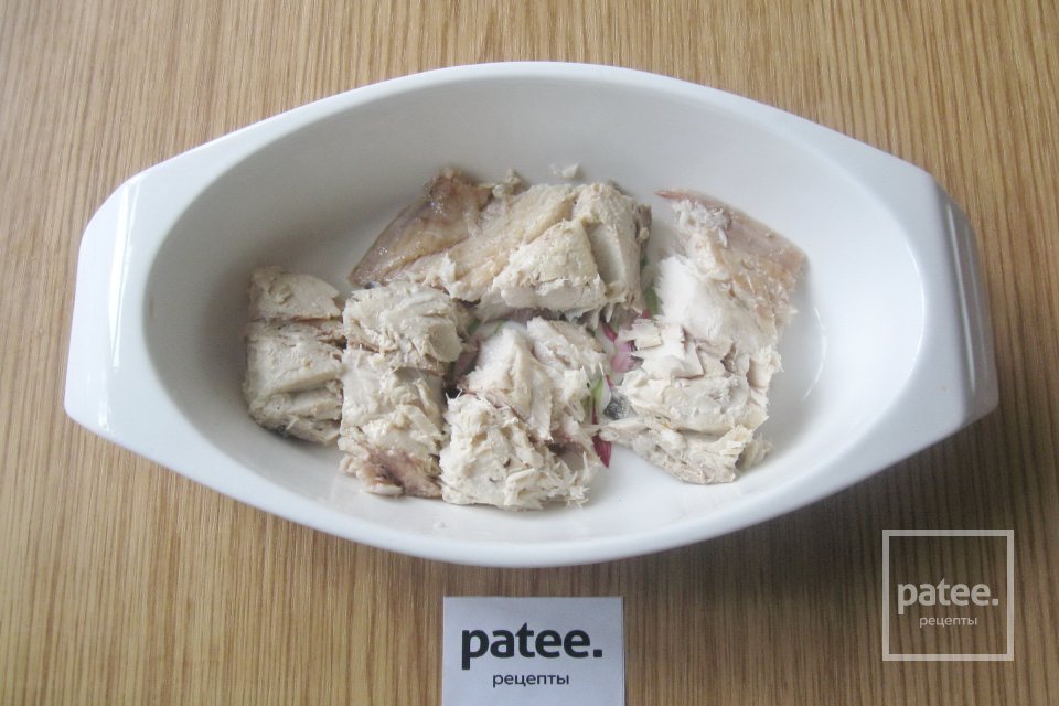 Лучше всего размять рыбку уже в той посуде, где и будет готовится салатик. Смазываем майонезом скумбрию. Затем мелко рубим лук и высыпаем поверх рыбки.