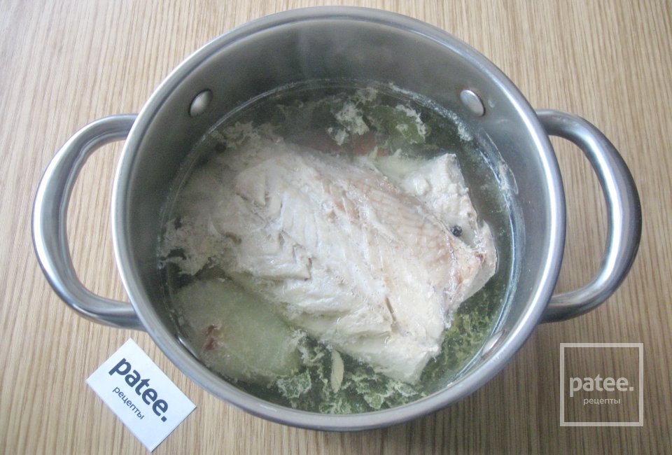Шаг 3. Заливаем рыбу 2 литрами воды, а также кладем очищенные овощи и варим в течение 15 минут после кипения. Одновременно снимаем всю пену, а также добавляем специи.